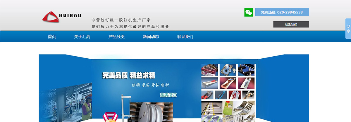 广州汇高机械设备有限公司,是工贸一体化企业。主要产品为弹性胶钉机和弹性胶钉,是专为玩具、餐具、首饰等行业解决了传统的纸绳和橡皮筋等传统手工包装方式,实现了机械化包装,大大提高包装速度。汇高技术实力雄厚,拥有一支高素质的技术工人和员工队伍。一直以来我们坚持“质量、效率、诚信、务实”的理念, 竭诚欢迎海内外新老客户光临惠顾,并建立长期友好的合作关系,共同开拓辉煌未来。
